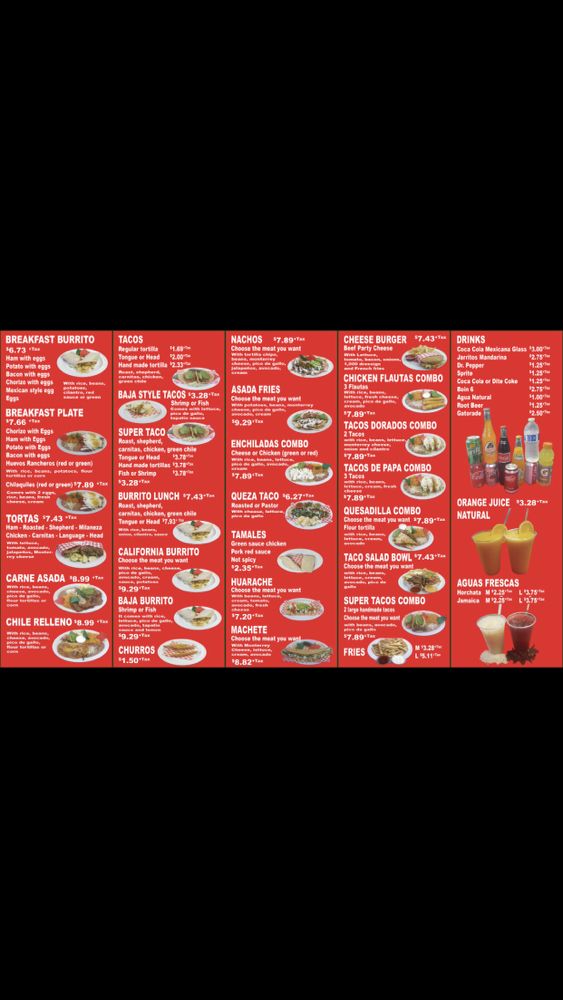 Served with Monterey Jack cheese, tomatoes, cilantro, onions, and choice of meat. Choose a meat: Chicken, Steak, Also pastor, Chile relleno, Carnitas. Choose a sauce: Red Sauce (spicy), Green Sauce (mild). Burrito's toppings: Rice, Beans, Cheese, Onions, Cilantro, Sour cream